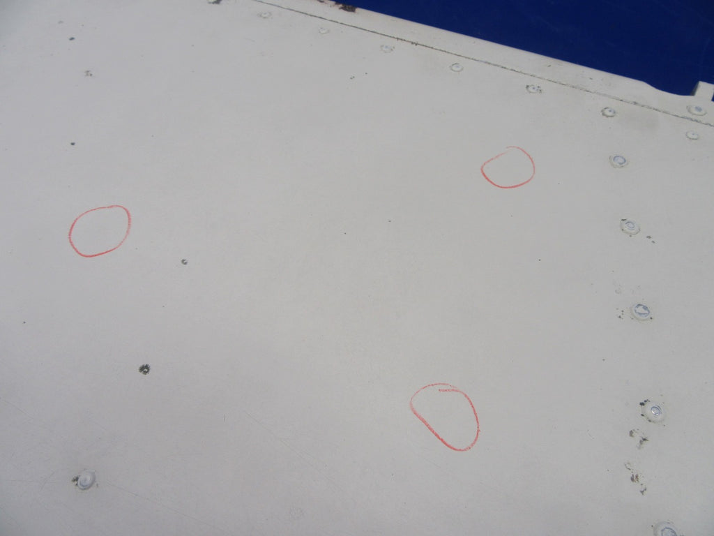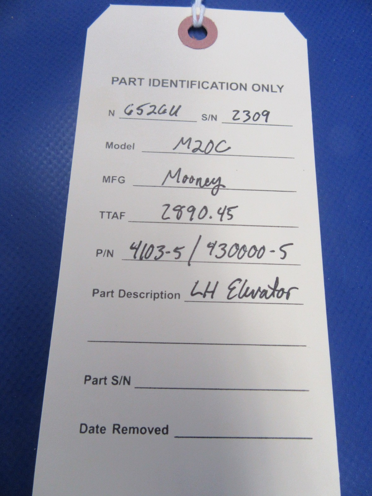 Mooney M20 / M20C LH Elevator P/N 4103-5 / 430000-5. Poor paint, very light hail (circled in photos). Removed from parted-out 1963 Mooney M20C N6526U, S/N 2309. Aircraft TT 2890.45. Guaranteed to pass inspection or your money back.