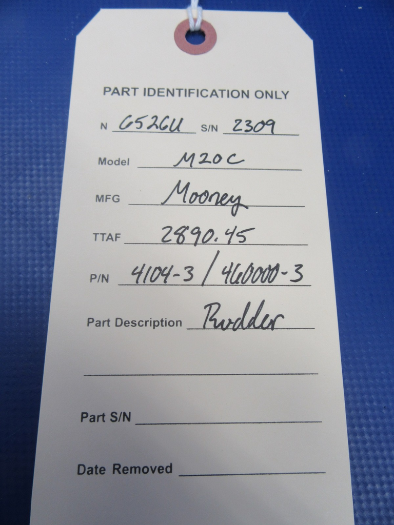 Mooney M20 / M20C Rudder P/N 4104-3 / 460000-3. Good condition other than poor paint. Removed from parted-out 1963 Mooney M20C N6526U, S/N 2309. Aircraft TT 2890.45. Guaranteed to pass inspection or your money back.