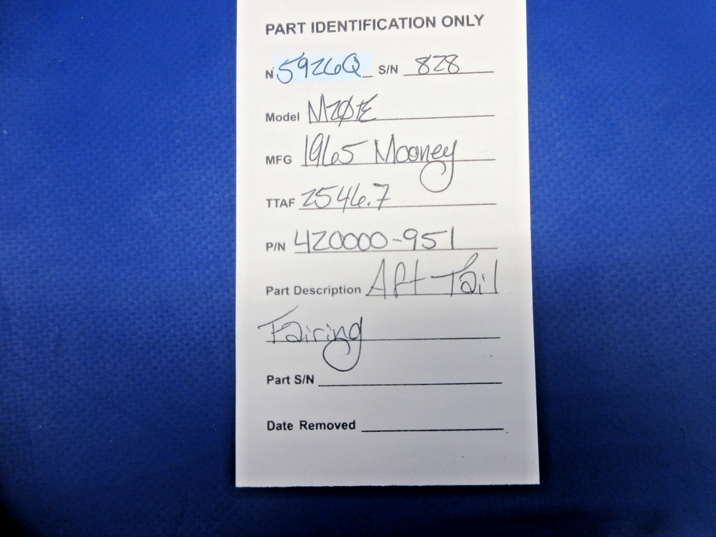 Mooney M20 / M20E AFT Tail Fairing. P/N 420000-951. Removed in good condition from a parted out 1965 Mooney M20E N5926Q, S/N 828. TTAF 2,546.7. Guaranteed to pass inspection or your money back.