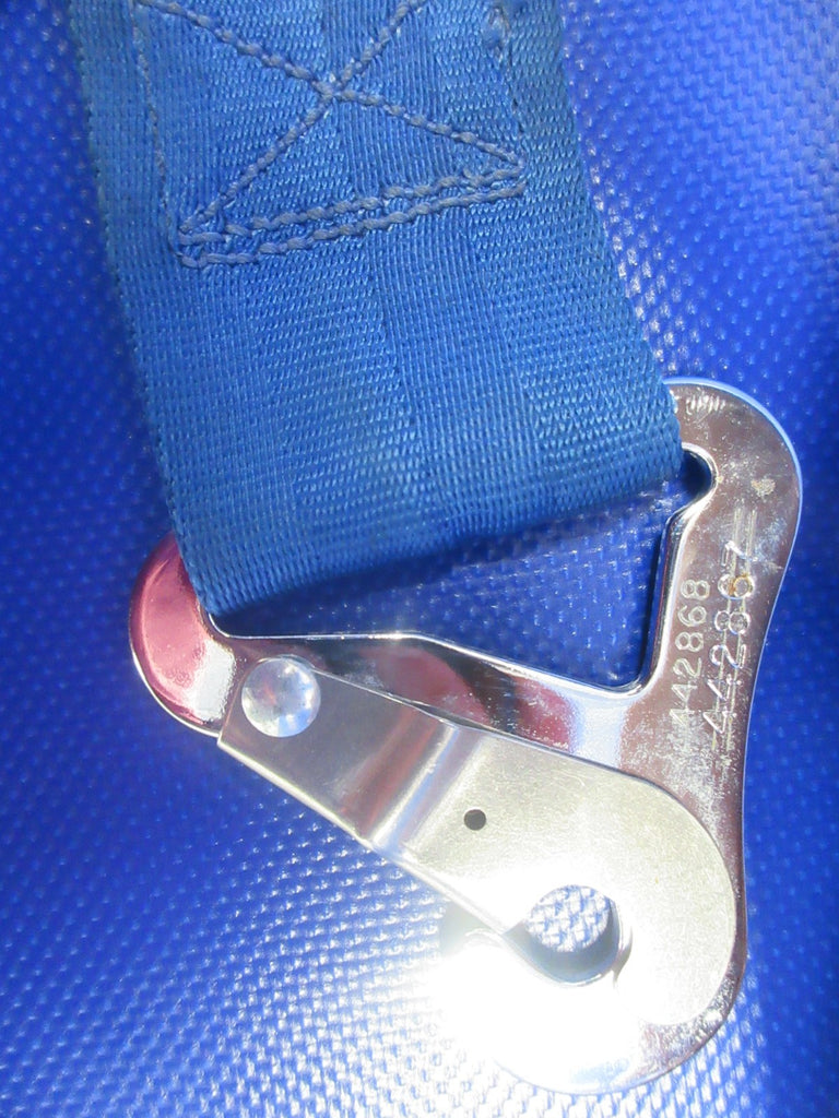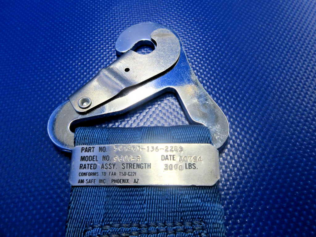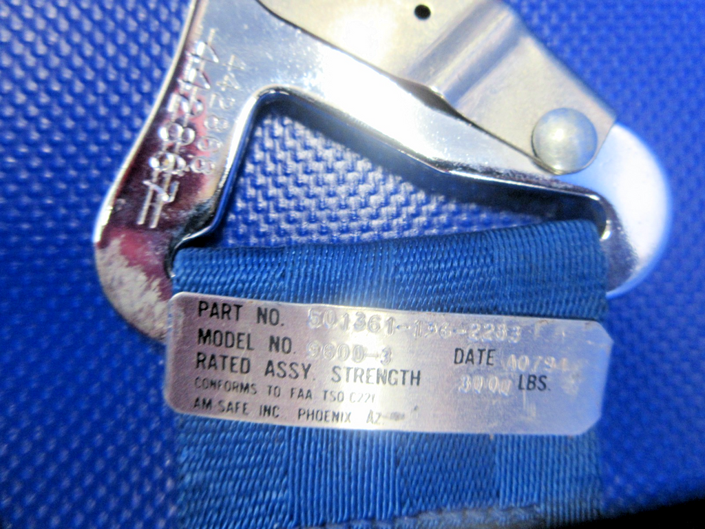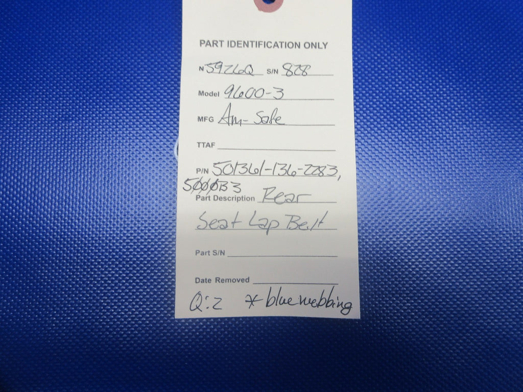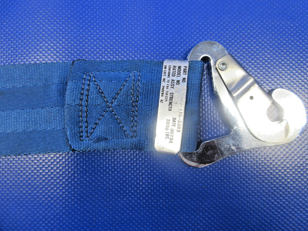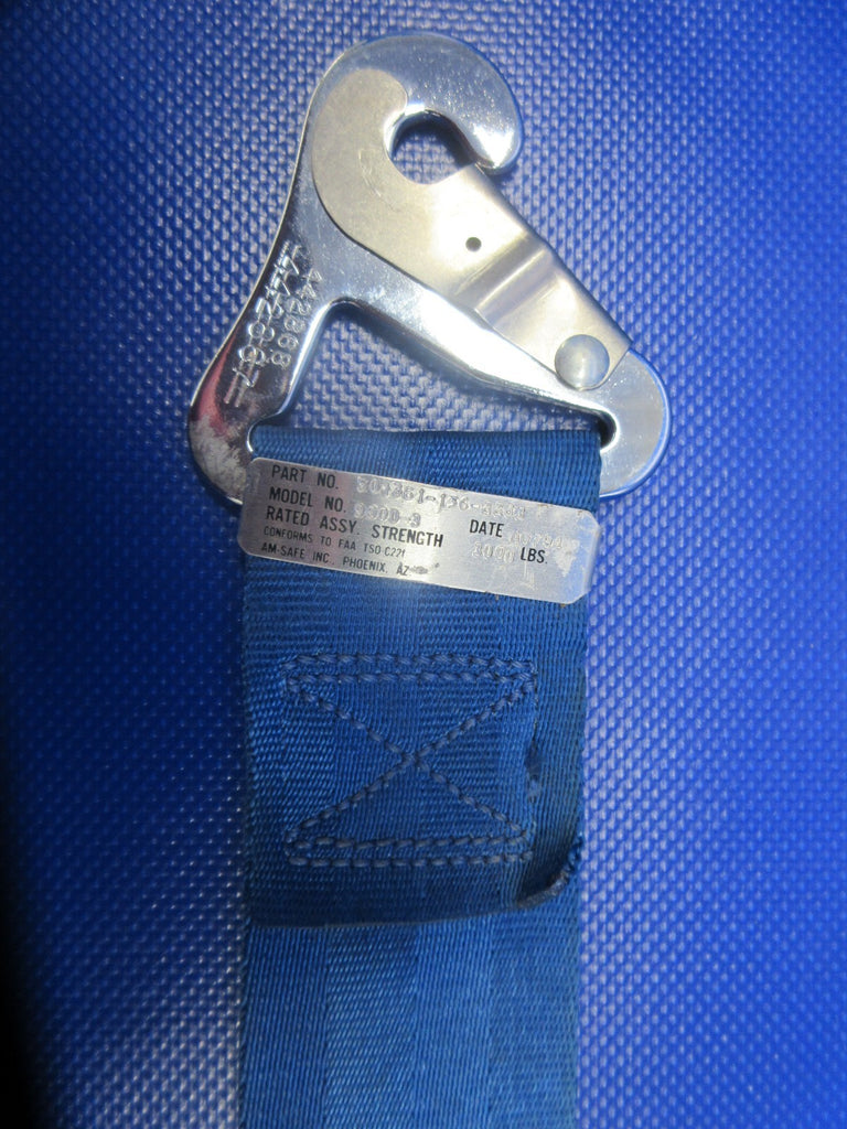 Mooney M20 / M20E Am-Safe Rear Seat Lap Belt. P/N 501361-136-2283, 5000B3. Blue Webbing. Due to multiple quantities buyer may not receive exact item pictured. Removed in good condition from a parted out 1965 Mooney M20E N5926Q, S/N 828. TTAF 2,546.7. Guaranteed to pass inspection or your money back.