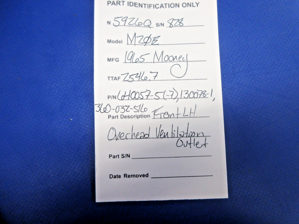 Mooney M20 / M20E Front Left Hand Overhead Ventilation Outlet. P/N 640057-5, 640057-7, 130078-1, 360-032-516. Removed in good condition from a parted out 1965 Mooney M20E N5926Q, S/N 828. TTAF 2,546.7. Guaranteed to pass inspection or your money back.