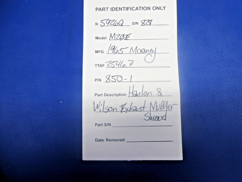 Mooney M20 / M20E Hanlon & Wilson Exhaust Muffler Shroud. P/N 850-1. Removed in good condition from a parted out 1965 Mooney M20E N5926Q, S/N 828. TTAF 2,546.7. Guaranteed to pass inspection or your money back.