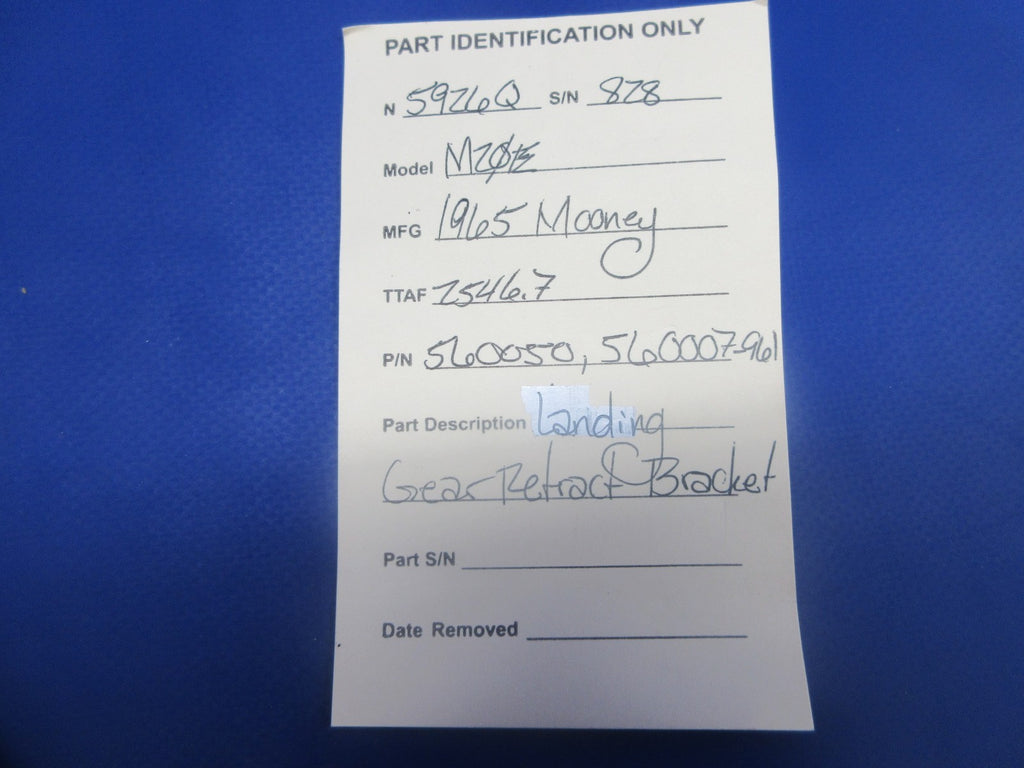 Mooney M20 / M20E Landing Gear Retract Bracket. P/N 560050, 560007-961. Removed in good condition from a parted out 1965 Mooney M20E N5926Q, S/N 828. TTAF 2,546.7. Guaranteed to pass inspection or your money back.