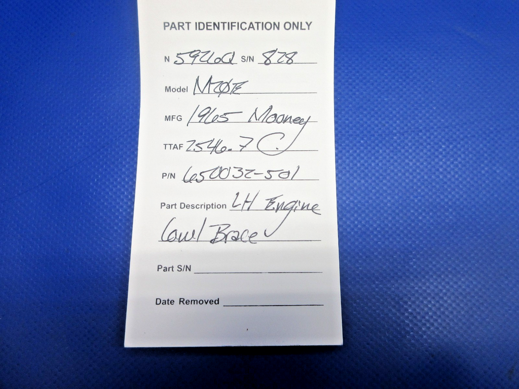 Mooney M20 / M20E Left Hand Engine Cowl Brace. P/N 650032-501. Removed in good condition from a parted out 1965 Mooney M20E N5926Q, S/N 828. TTAF 2,546.7. Guaranteed to pass inspection or your money back.