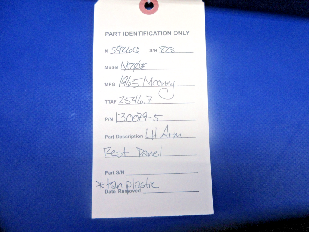 Mooney M20 / M20E Left Hand Arm Rest Panel. P/N 130079-5. Tan Plastic. Removed in good condition from a parted out 1965 Mooney M20E N5926Q, S/N 828. TTAF 2,546.7. Guaranteed to pass inspection or your money back.