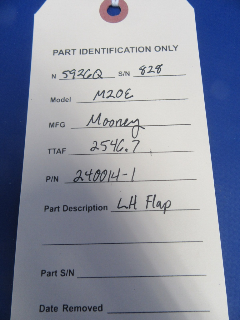 Mooney M20 / M20E LH Flap P/N 240014-1. Couple of minor dings and scraping at very inboard end, see photos. Removed from parted-out 1965 Mooney M20E N5926Q, S/N 828. Aircraft TT 2546.7. Guaranteed to pass inspection or your money back.