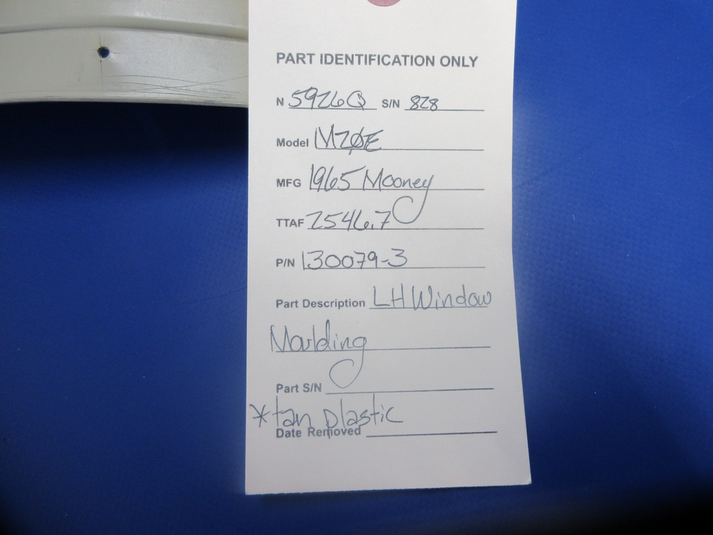 Mooney M20 / M20E Left Hand Window Moulding. P/N 130079-3. Tan Plastic. Removed in good condition from a parted out 1965 Mooney M20E N5926Q, S/N 828. TTAF 2,546.7. Guaranteed to pass inspection or your money back.