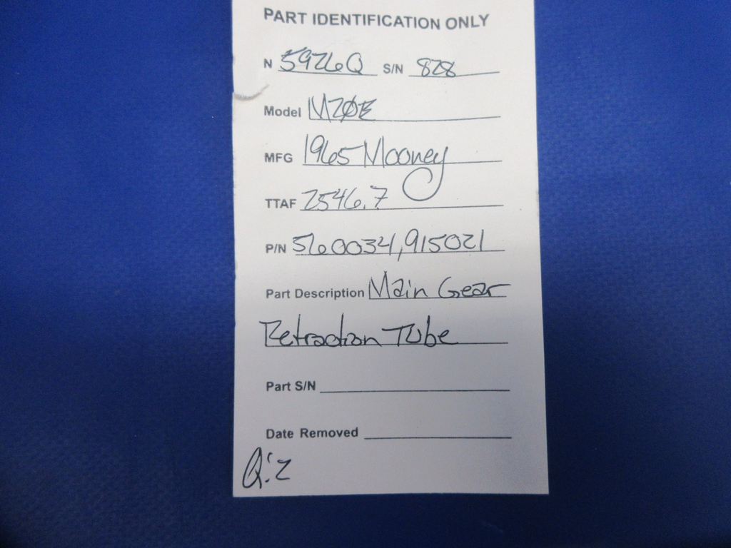 Mooney M20 / M20E Main Gear Retraction Tube. P/N 560034, 915020. Due to multiple quantities buyer may not receive exact item pictured. Removed in good condition from a parted out 1965 Mooney M20E N5926Q, S/N 828. TTAF 2,546.7. Guaranteed to pass inspection or your money back.