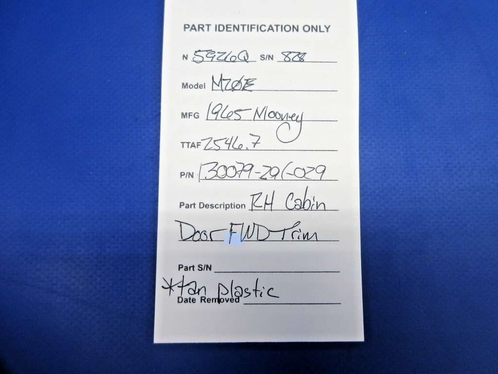 Mooney M20 / M20E Right Hand Cabin Door Forward Trim. P/N 130079-29, 130079-029. Tan Plastic. Removed in good condition from a parted out 1965 Mooney M20E N5926Q, S/N 828. TTAF 2,546.7. Guaranteed to pass inspection or your money back.