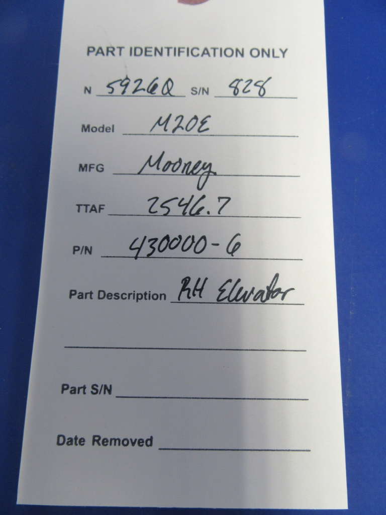 Mooney M20 / M20E RH Elevator P/N 430000-6. Fair paint, no hail, couple very minor dings, see photos. Removed from parted-out 1965 Mooney M20E N5926Q, S/N 828. Aircraft TT 2546.7. Guaranteed to pass inspection or your money back.