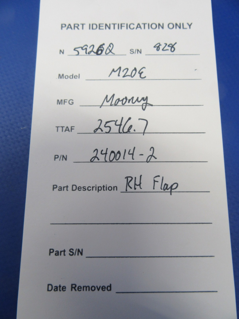 Mooney M20 / M20E RH Flap P/N 240014-2. Minor dings, see photos. Removed from parted out 1965 Mooney M20E N5926Q, S/N 828. Aircraft TT 2546.7. Guaranteed to pass inspection or your money back.