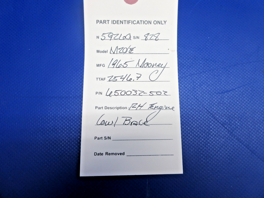 Mooney M20 / M20E Right Hand Engine Cowl Brace Brace. P/N 650032-502. Removed in good condition from a parted out 1965 Mooney M20E N5926Q, S/N 828. TTAF 2,546.7. Guaranteed to pass inspection or your money back.
