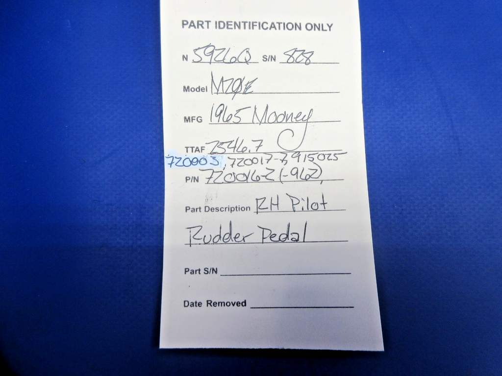 Mooney M20 / M20E Right Hand Pilot Rudder Pedal. P/N 720016-2, 720016-962, 720003, 720017-7, 915025. Removed in good condition from a parted out 1965 Mooney M20E N5926Q, S/N 828. TTAF 2,546.7. Guaranteed to pass inspection or your money back.