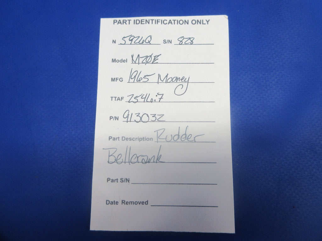Mooney M20 / M20E Rudder Bellcrank. P/N 913032. Removed in good condition from a parted out 1965 Mooney M20E N5926Q, S/N 828. TTAF 2,546.7. Guaranteed to pass inspection or your money back.