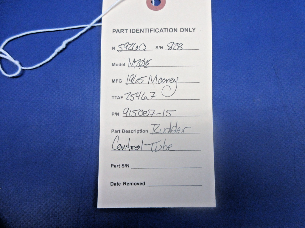 Mooney M20 / M20E Rudder Control Tube. P/N 915007-15. Removed in good condition from a parted out 1965 Mooney M20E N5926Q, S/N 828. TTAF 2,546.7. Guaranteed to pass inspection or your money back.