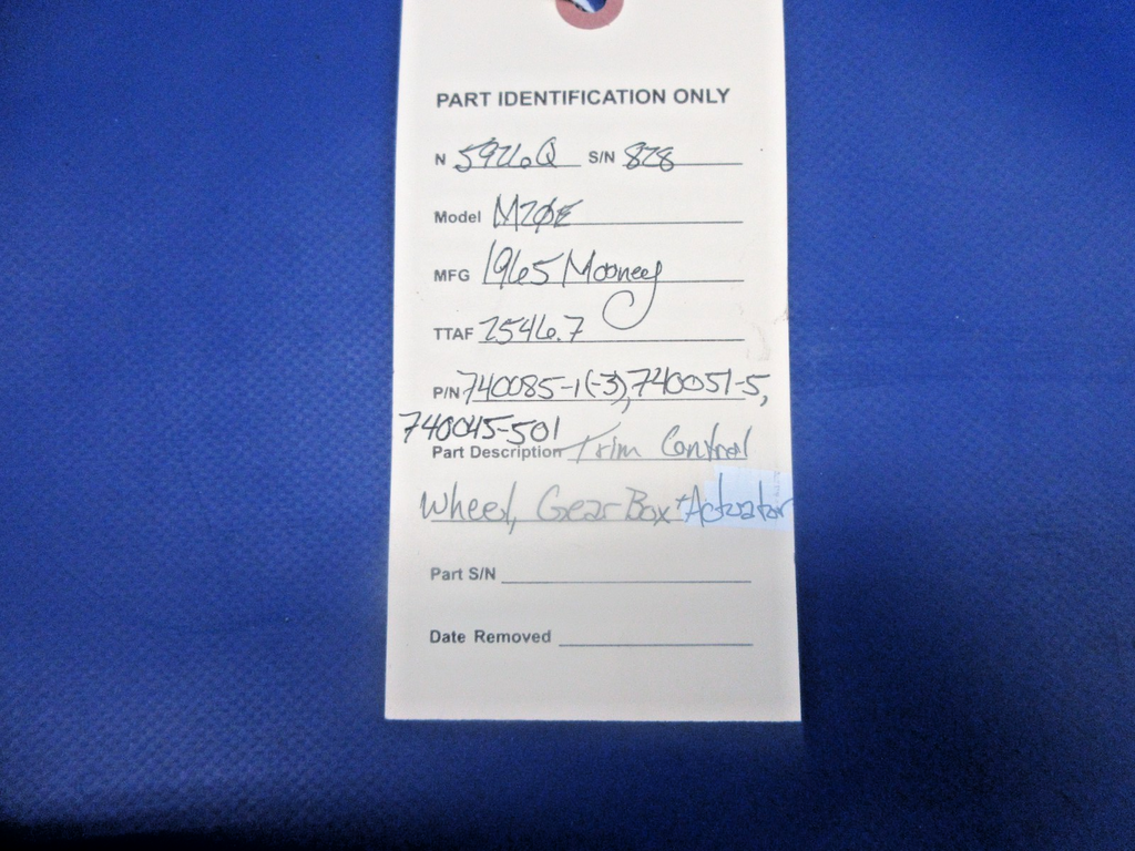 Mooney M20 / M20E Trim Control Wheel Gear Box Actuator. P/N 740085-1, 740085-3, 740051-5, 740045-501. Removed in good condition from a parted out 1965 Mooney M20E N5926Q, S/N 828. TTAF 2,546.7. Guaranteed to pass inspection or your money back.
