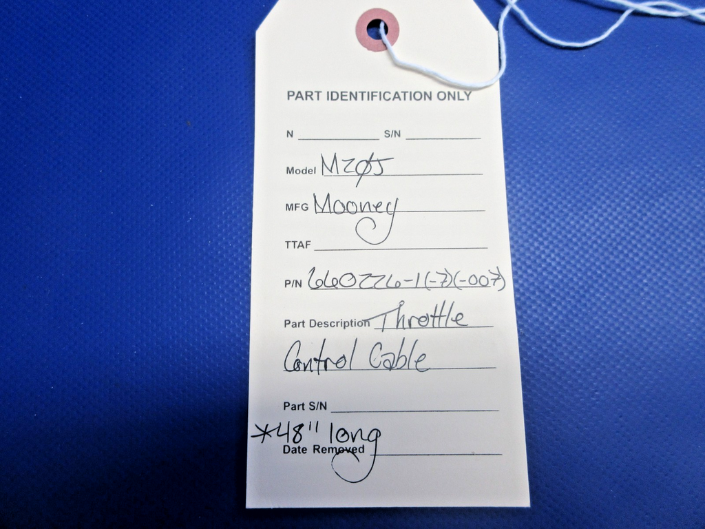 Mooney M20J Throttle Control Cable. P/N 660226-1, 660226-7, 660226-007. 48" Long. Guaranteed to pass inspection or your money back.