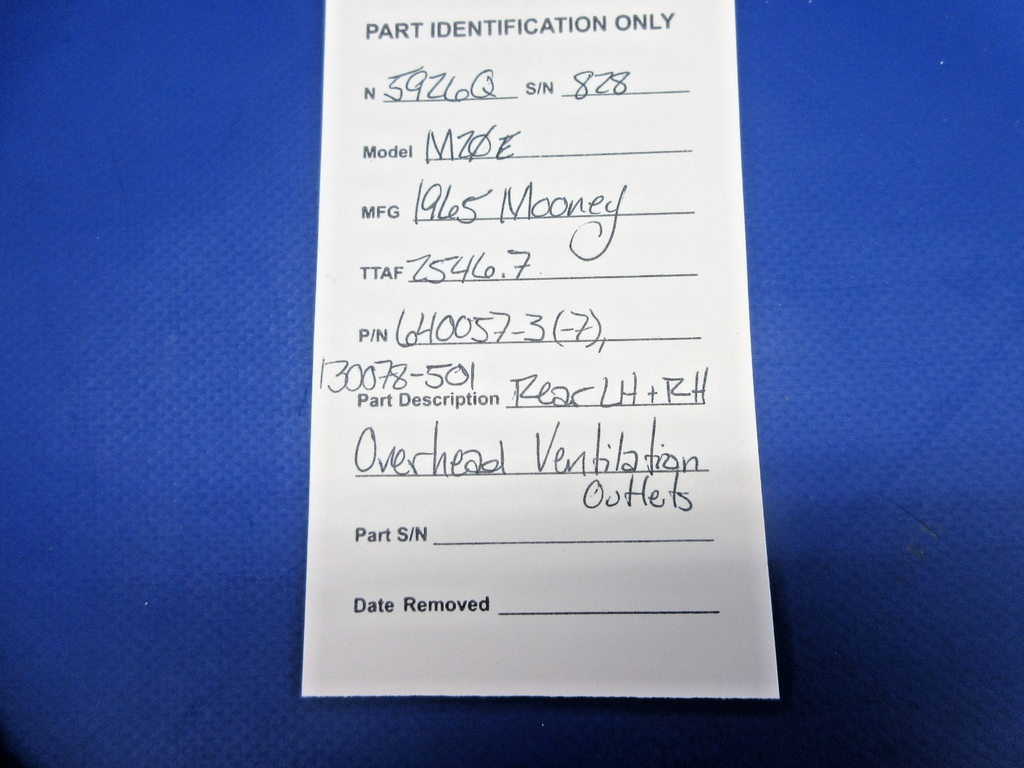 Mooney M20E Rear Left Hand & Right Hand Overhead Ventilation Outlets. P/N 640057-3, 640057-7, 130078-501. Removed in good condition from a parted out 1965 Mooney M20E N5926Q, S/N 828. TTAF 2,546.7. Guaranteed to pass inspection or your money back.