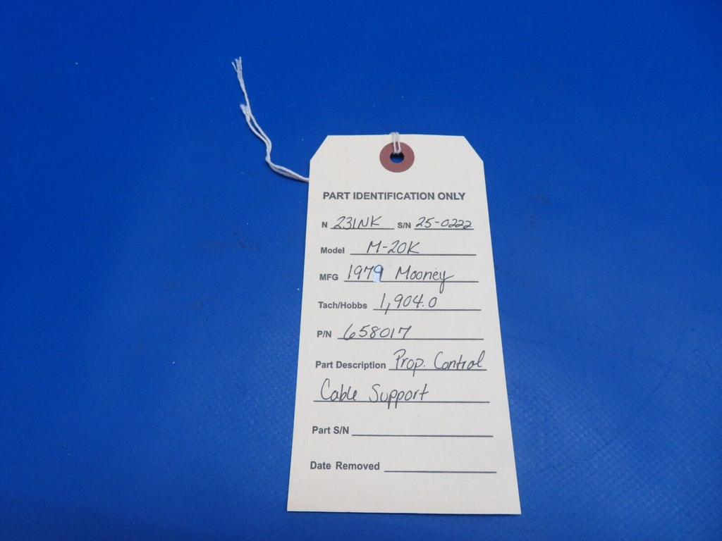 Mooney M20 / M20K Continental Prop. Control Cable Support. P/N 658017. Removed in good condition from a parted out 1979 Mooney M20K N231NK, S/N 25-0222. TTAF 1,904.0. Guaranteed to pass inspection or your money back.