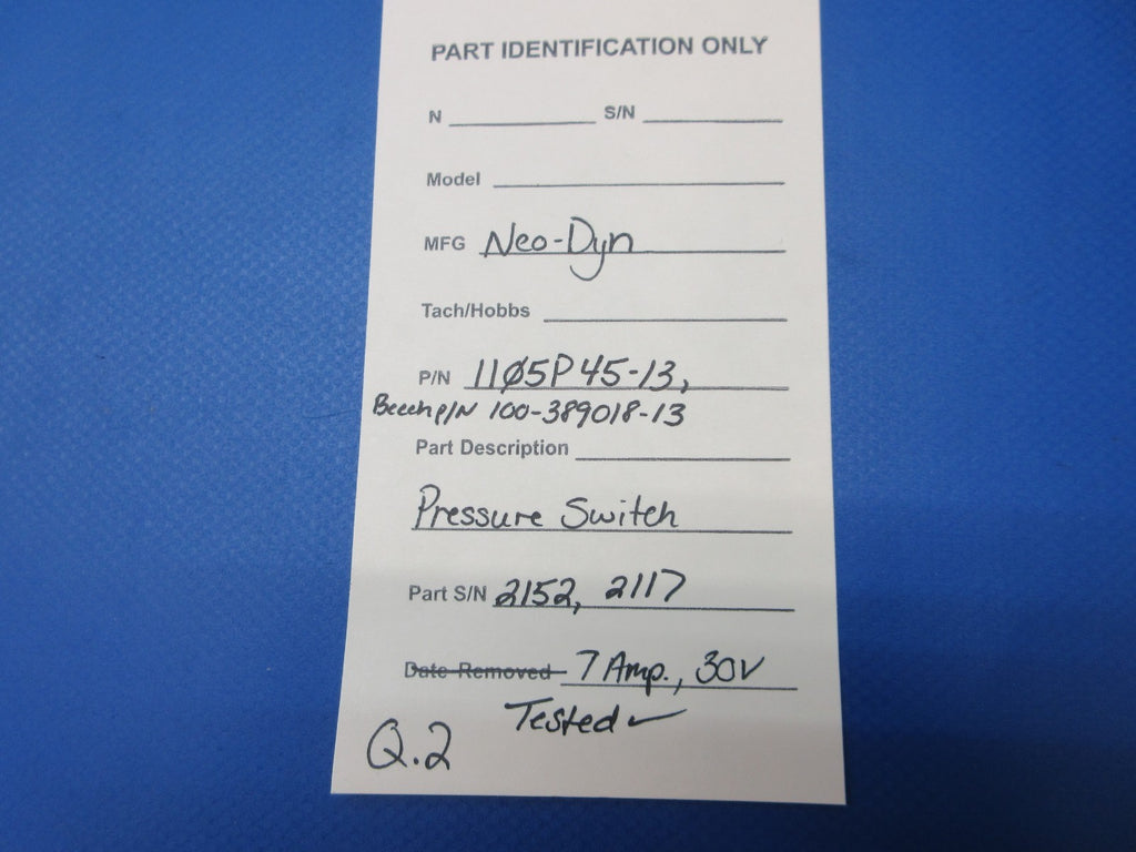 Neo-Dyn Pressure Switch. P/N 1105P45-13. Beech P/N 100-389018-13. S/N 2152, 2117. 7 amp, 30 volts. This item was recently tested and found to be in working condition. Due to multiple quantities, buyer may not receive exact item pictured. Guaranteed to pass inspection or your money back.