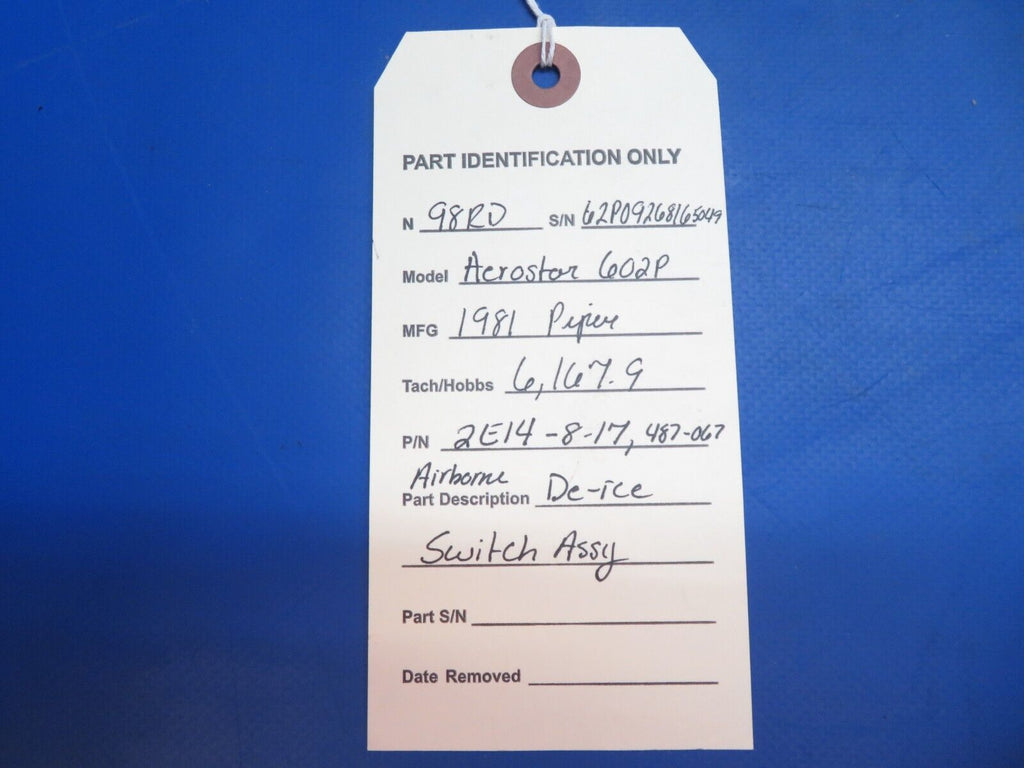 Piper Aerostar 602P Airborne De-Ice Switch Assembly. P/N 2E14-8-17, 487-067. Removed in good condition from a parted out 1981 Piper Aerostar 602P N98RD, S/N 62P09268165049. TTAF 6,167.9. Guaranteed to pass inspection or your money back.