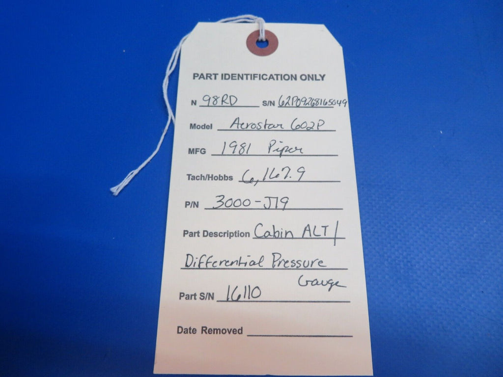 Piper Aerostar 602P Cabin ALT / Differential Pressure Gauge. P/N 3000-J19. S/N 16110. We are unable to test this item, however we are selling it with a 30 day money back guarantee. Removed in good condition from a parted out 1981 Piper Aerostar 602P N98RD, S/N 62P09268165049. TTAF 6,167.9. Guaranteed to pass inspection or your money back.