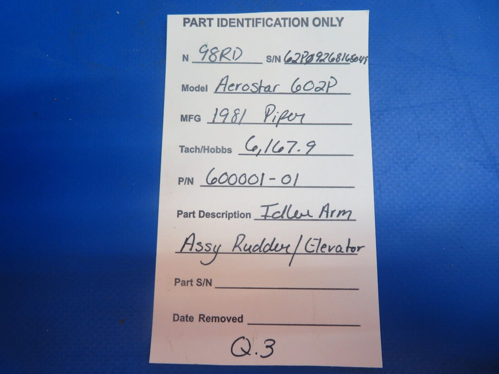 Piper Aerostar 602P Idler Arm Assembly Rudder / Elevator. P/N 600001-01. Due to multiple quantities, buyer may not receive exact item pictured. Removed in good condition from a parted out 1981 Piper Aerostar 602P N98RD, S/N 62P09268165049. TTAF 6,167.9. Guaranteed to pass inspection or your money back.