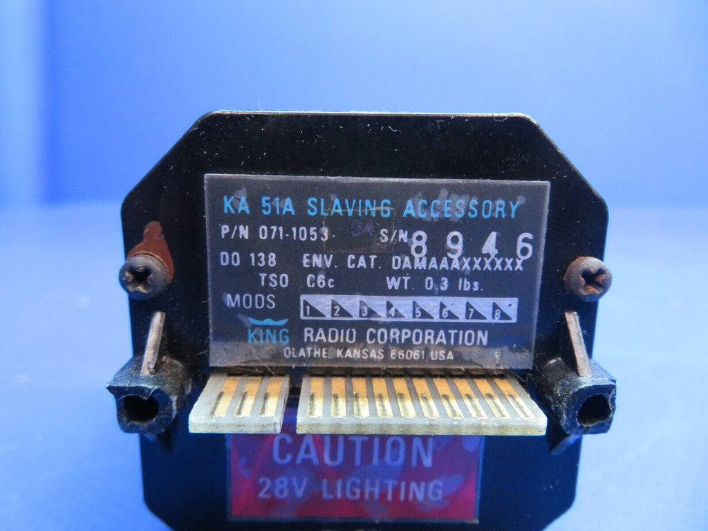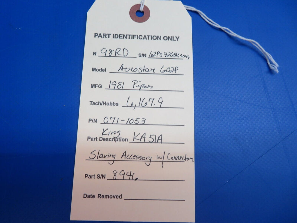 Piper Aerostar 602P King KA51A Slaving Accessory with Connector. P/N 071-1053. S/N 8946. We are unable to test this item, however we are selling it with a 30 day money back guarantee. Removed in good condition from a parted out 1981 Piper Aerostar 602P N98RD, S/N 62P09268165049. TTAF 6,167.9. Guaranteed to pass inspection or your money back.