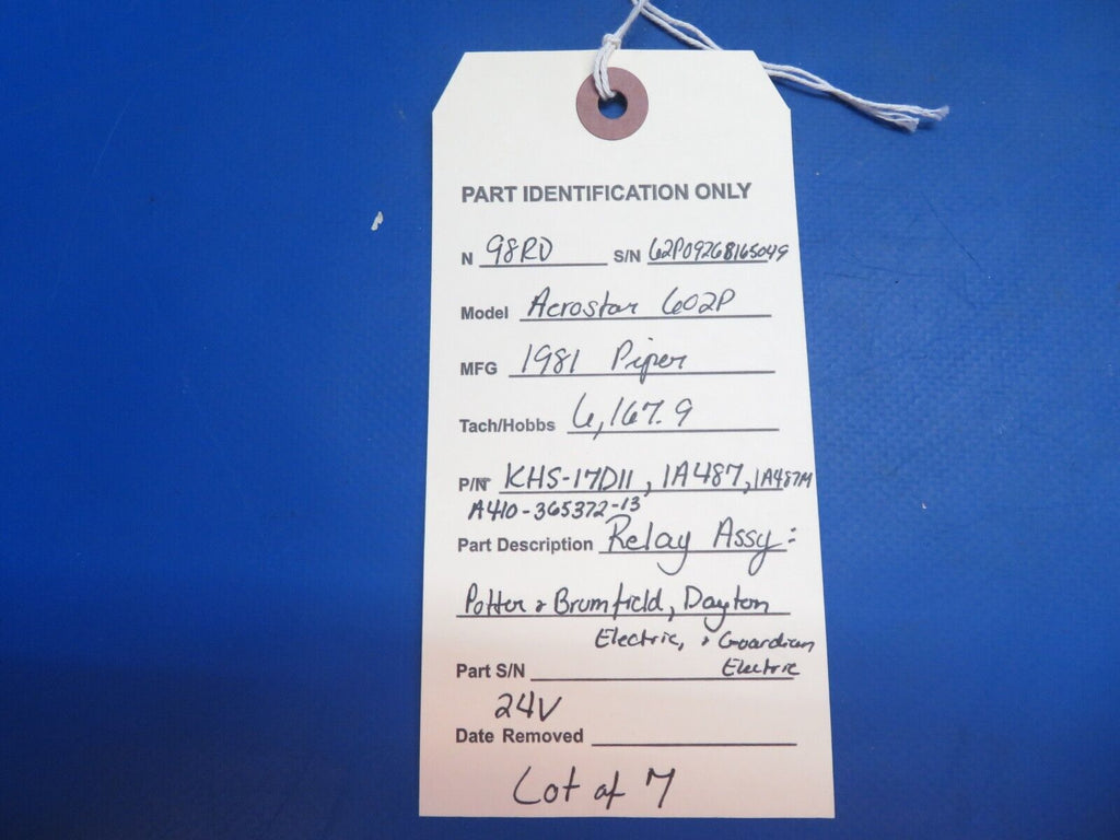 Piper Aerostar 602P Relay Assembly: Potter & Brumfield, Dayton Electric, Guardian Electric 24 Volts. P/N KHS-17D11, 1A487, 1A487M, A410-365372-13. LOT OF 7. Removed in good condition from a parted out 1981 Piper Aerostar 602P N98RD, S/N 62P09268165049. TTAF 6,167.9. Guaranteed to pass inspection or your money back.