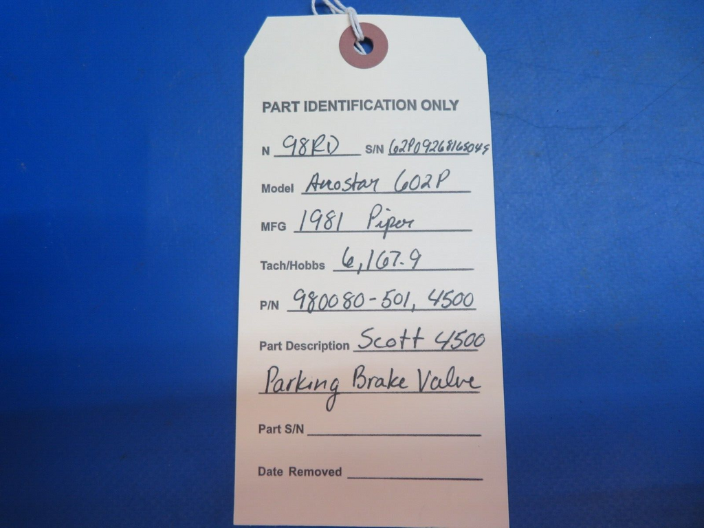 Piper Aerostar 602P Scott 4500 Parking Brake Valve. P/N 980080-501, 4500. Removed in good condition from a parted out 1981 Piper Aerostar 602P N98RD, S/N 62P09268165049. TTAF 6,167.9. Guaranteed to pass inspection or your money back.