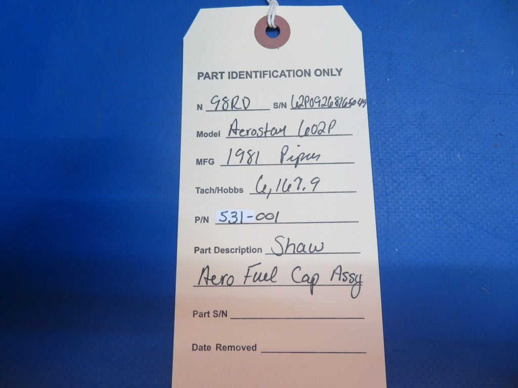 Piper Aerostar 602P Shaw Aero Fuel Cap Assembly. P/N 531-001. Removed in good condition from a parted out 1981 Piper Aerostar 602P N98RD, S/N 62P09268165049. TTAF 6,167.9. Guaranteed to pass inspection or your money back.