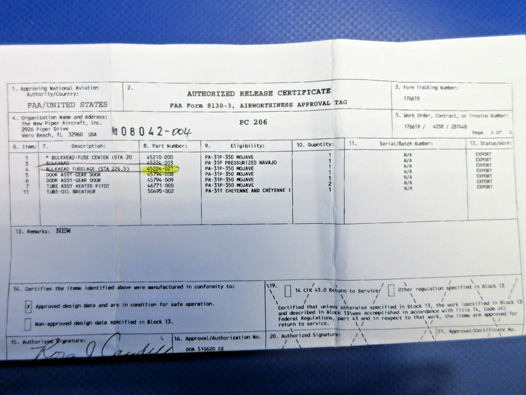 Piper 31P-350 Mojave Bottom Left Hand Fuselage Bulkhead Station 224.5 With 8130. P/N 45224-21, 45224-021. NEW OLD STOCK. Guaranteed to pass inspection or your money back.