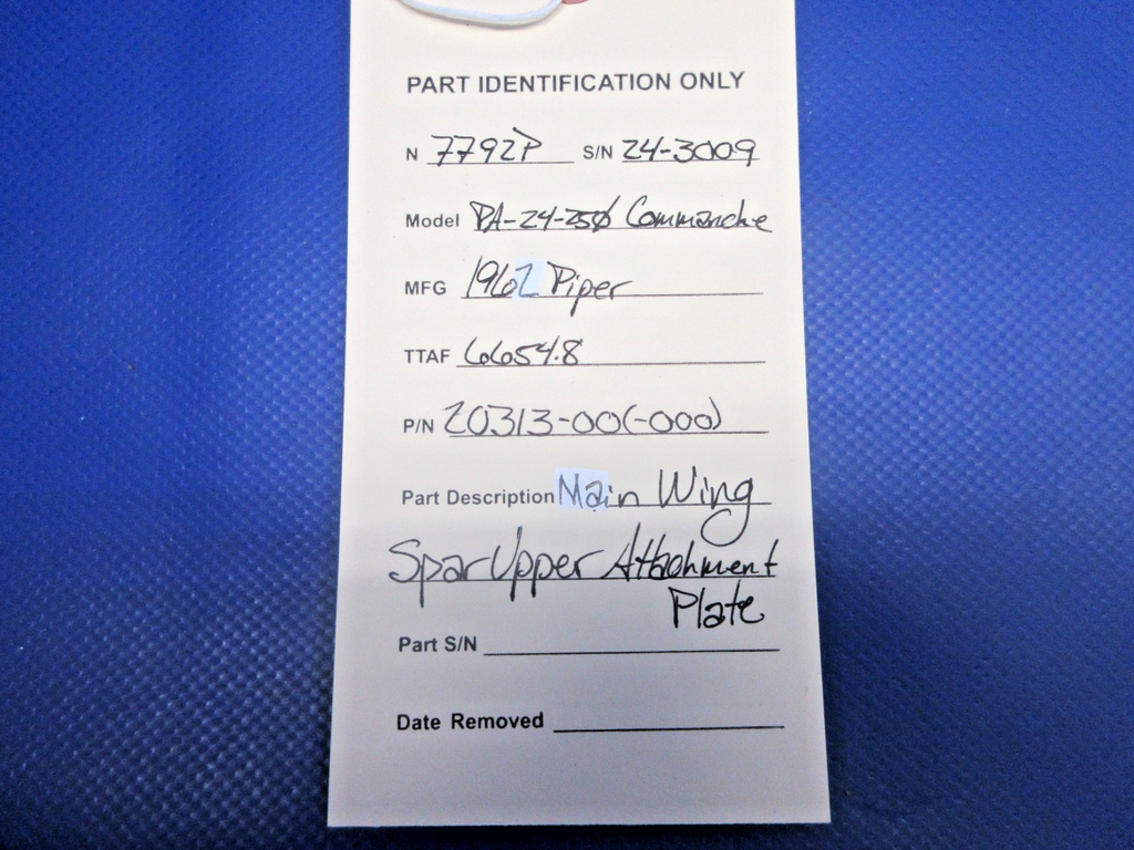 Piper PA-24-250 Comanche Main Wing Spar Upper Attachment Plate P/N 20323-00,20313-000. Removed in good condition from a parted out 1962 Piper PA-24-250 Comanche N7792P, S/N 24-3009. TTAF 6,654.8. Guaranteed to pass inspection or your money back.