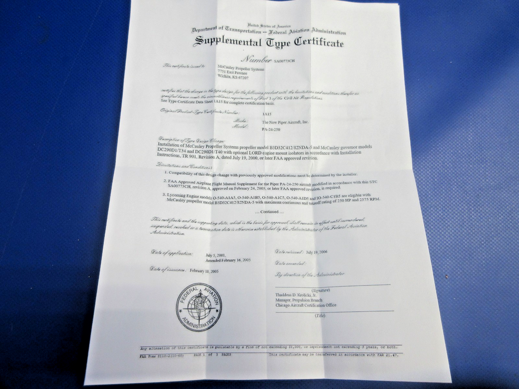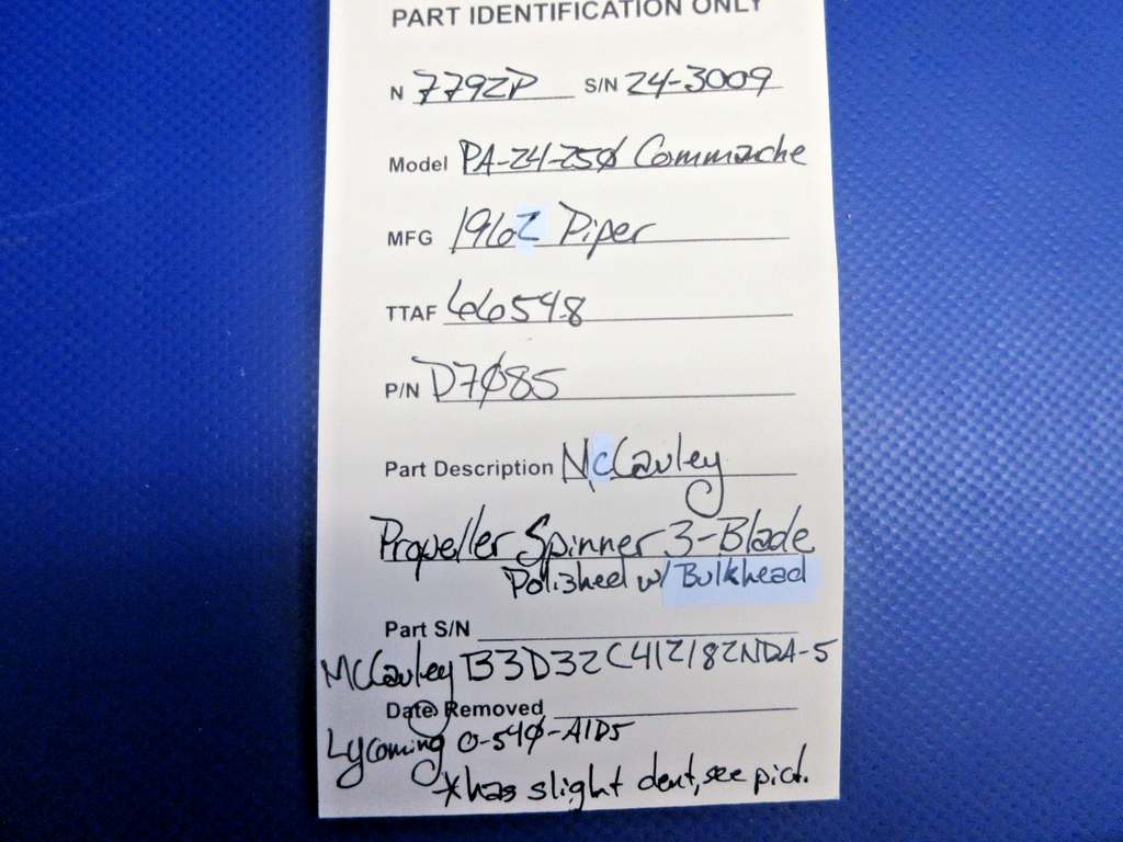 Piper PA-24-250 Comanche McCauley Propeller Spinner 3-Blade with Bulkhead STC # SA00773CH. P/N D7085. Polished. McCauley B3D32C412182NDA-5. Lycoming O-540-A1D5. Has slight dent see pictures. Removed in good condition from a parted out 1962 Piper PA-24-250 Comanche N7792P, S/N 24-3009. TTAF 6,654.8. Guaranteed to pass inspection or your money back.
