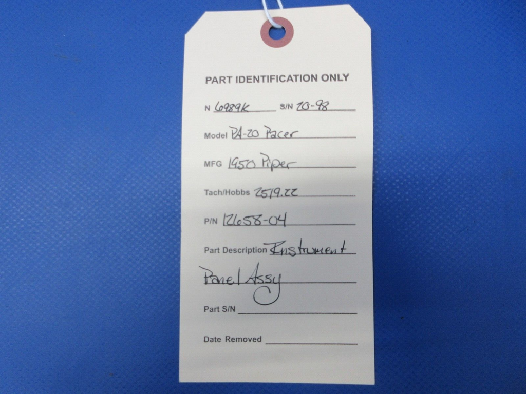 Piper PA-20 Pacer Instrument Panel Assembly. P/N 12658-04, 12658-004. Has some damage, see pictures. Removed in good condition from a parted out 1950 Piper PA-20 Pacer N6989K, S/N 20-98. TTAF 2,519.22. Guaranteed to pass inspection or your money back.