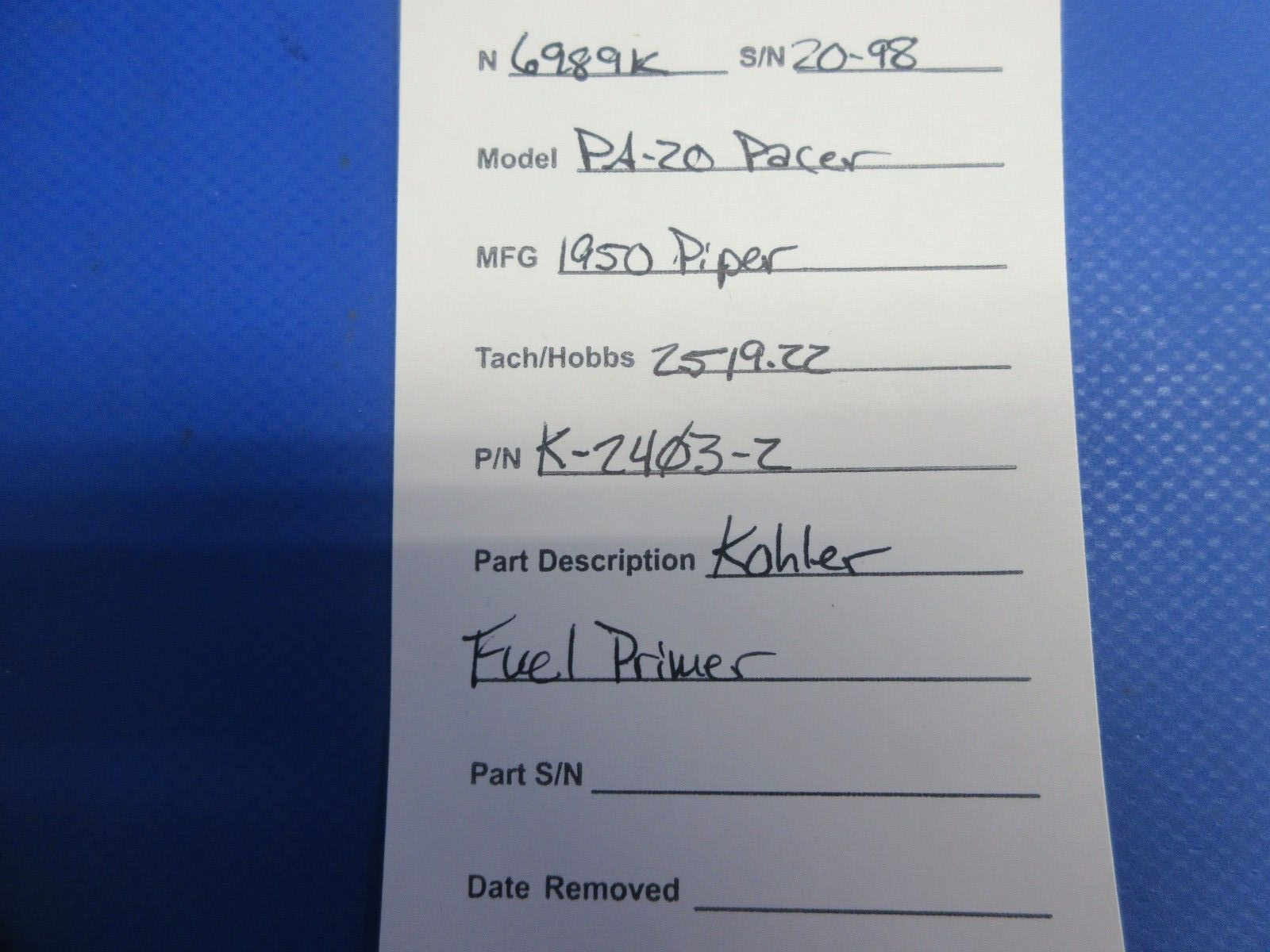 Piper PA-20 Pacer Kohler Fuel Primer. P/N K-2403-2. Removed in good condition from a parted out 1950 Piper PA-20 Pacer N6989K, S/N 20-98. TTAF 2,519.22. Guaranteed to pass inspection or your money back.