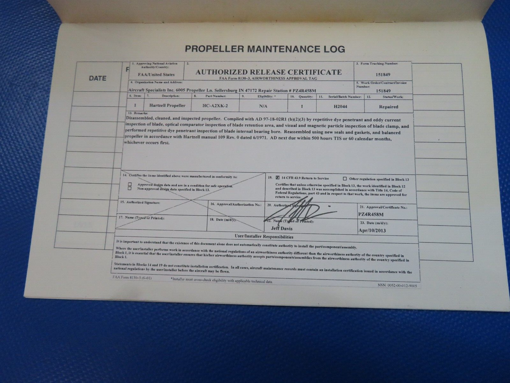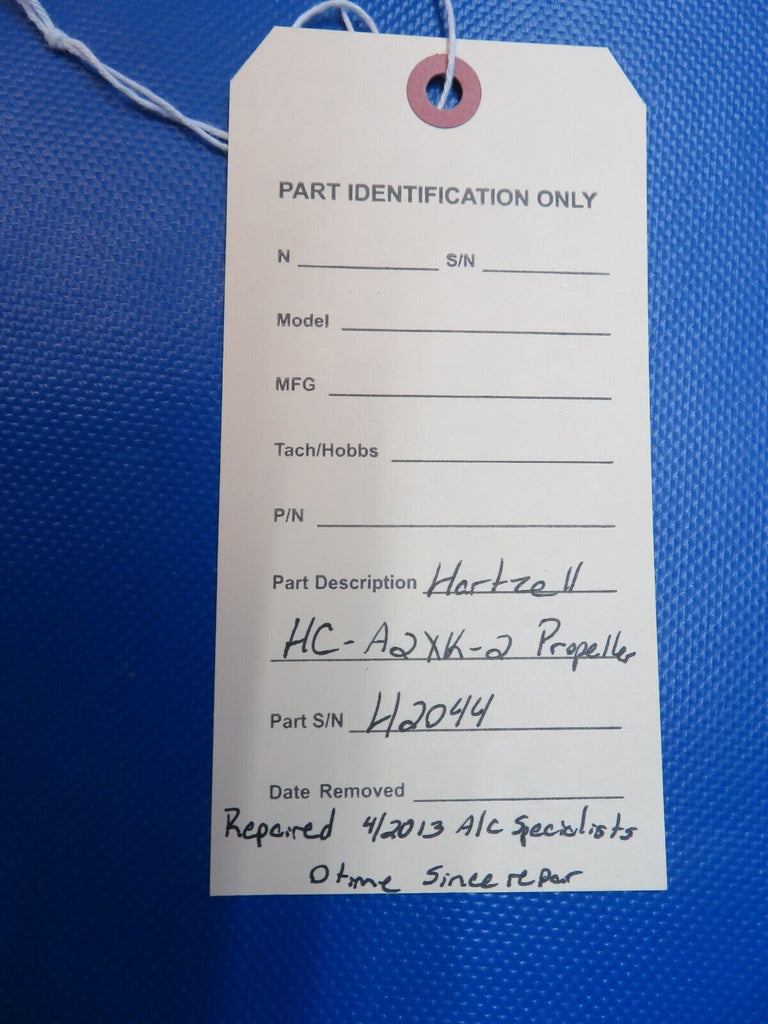 Hartzell HC-A2XK-2 Aircraft Propeller S/N H2044. Total time unknown. 0 hours since last 500 hour inspection by Aircraft Specialists in April 2013 (A.D. 97-18-02 r1), due again per calendar time. We do not have any log books showing the SMOH or the TSN. The only log we have is the one that is pictured showing the AD compliance in 2013. This propeller appears to be very low time or even possibly new or 0.0 SMOH. This propeller was installed on a hangar kept Aztec project with a Lycoming IO-540-A1D5. The engine was not ran with this prop after it was repaired but it was installed. Removed from parted-out 1960 Piper PA-23-250 Aztec N4626P, S/N 27-144. Aircraft TT 2530.3. Guaranteed to pass inspection or your money back.
