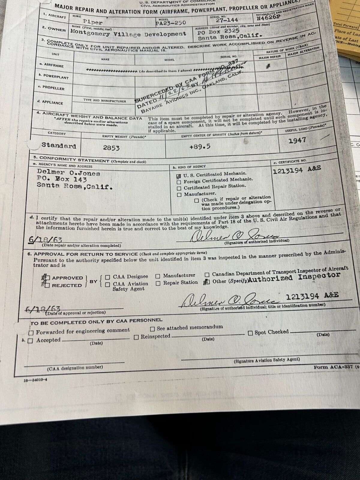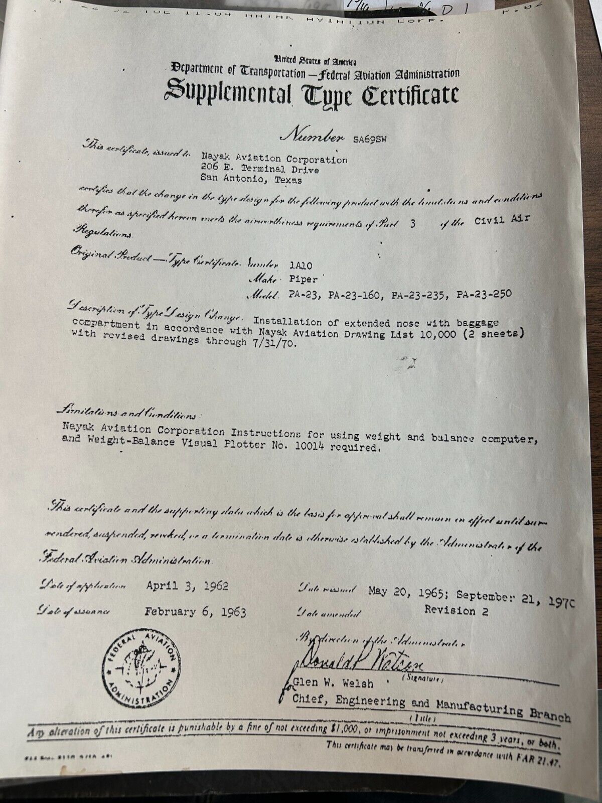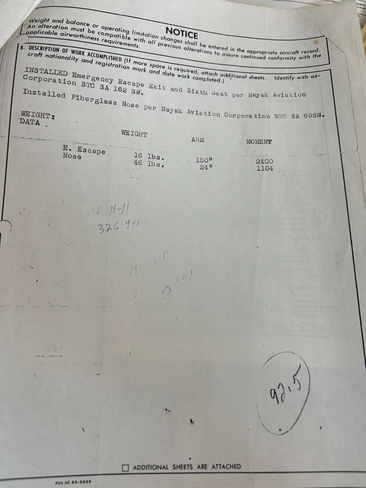 Piper PA-23 Nayak Aviation Extended Nose and Baggage Compartment. STC SA69SW. Removed in good condition from a parted out 1960 Piper PA-23-250 Aztec N4626P, S/N 27-144. TTAF 2,530.3. Guaranteed to pass inspection or your money back.