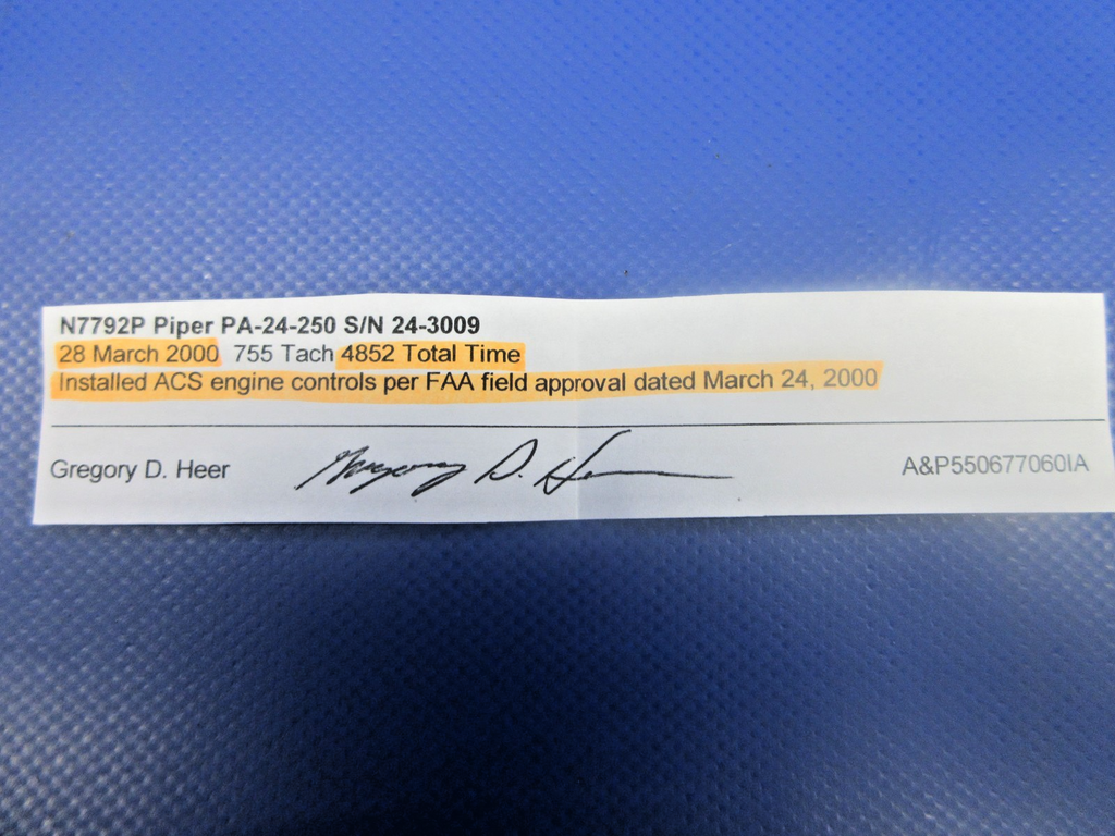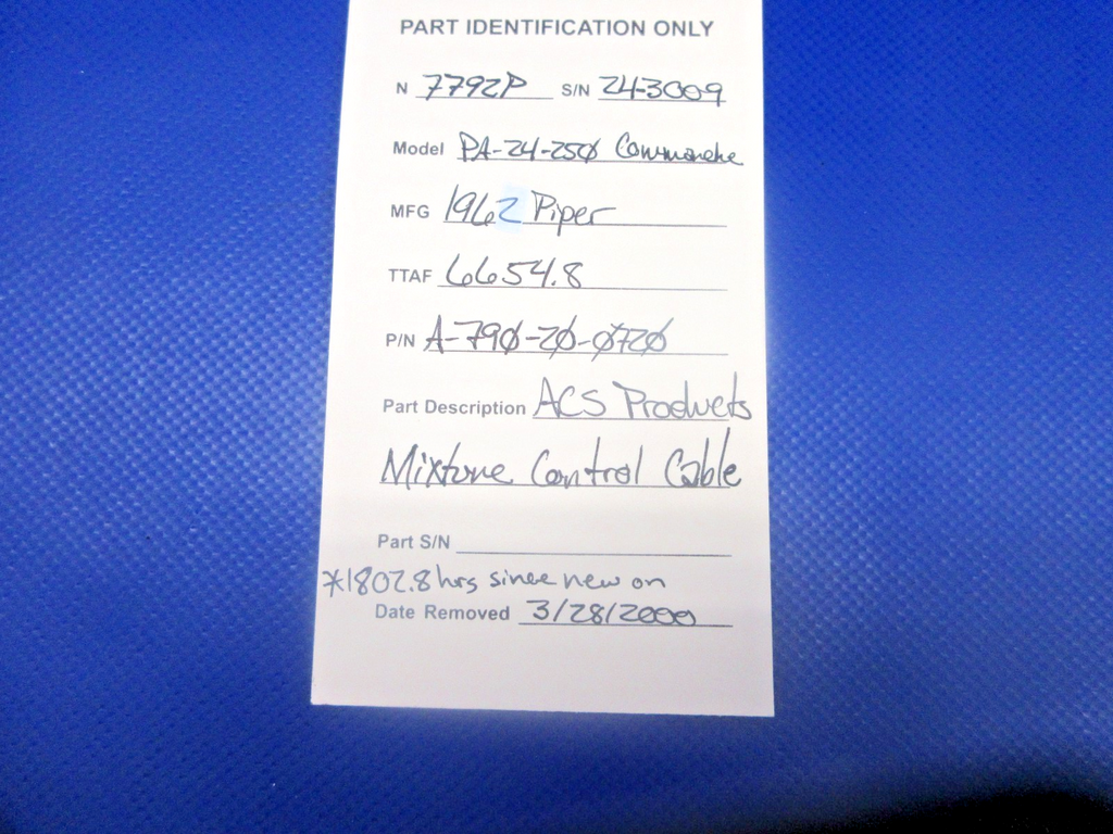 Piper PA-24-250 Comanche ACS Products Mixture Control Cable. P/N A-790-20-0720. 1802.8 hours since new on 03/28/2000. Removed in good condition from a parted out 1958 Piper PA-24-250 Comanche N5410P, S/N 24-464. TTAF 3,086.9. Guaranteed to pass inspection or your money back.
