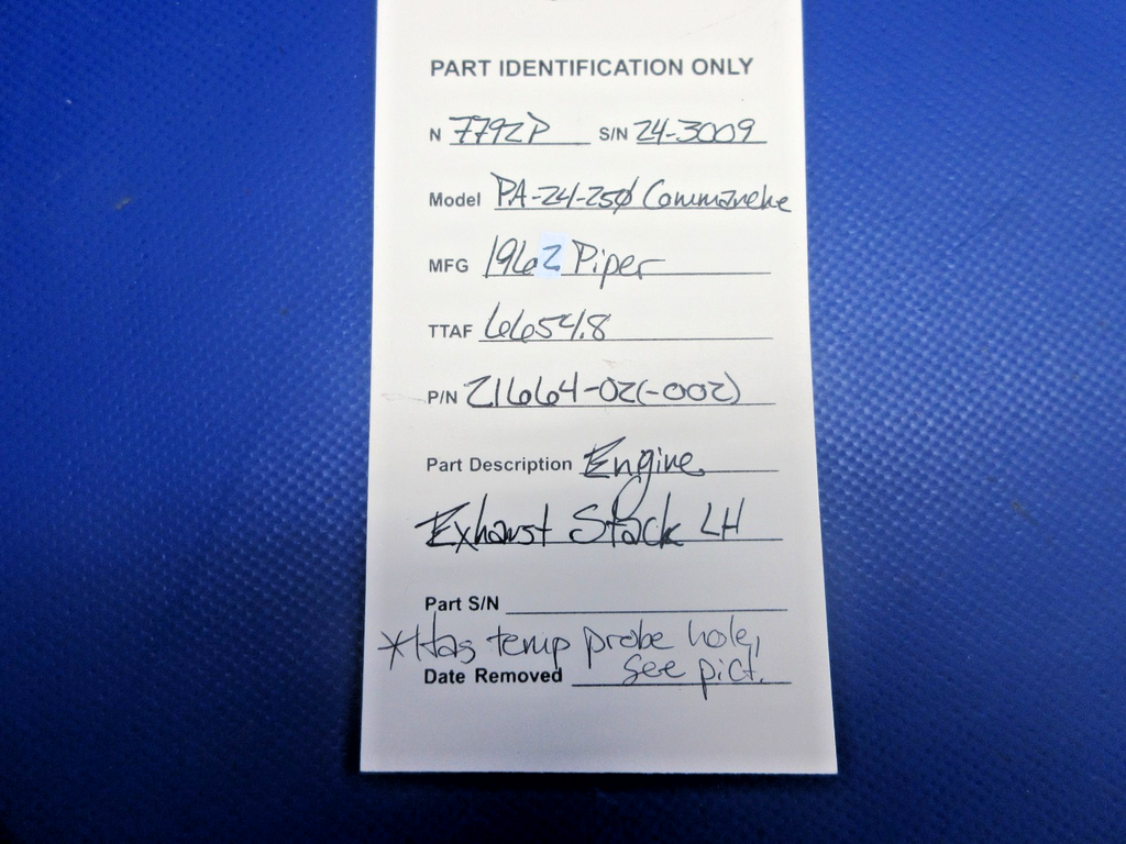 Piper PA-24-250 Comanche Engine Exhaust Stack Left Hand. P/N 21664-02, 21664-002. Has temp probe hole, see pictures. Removed in good condition from a parted out 1962 Piper PA-24-250 Comanche N7792P, S/N 24-3009. TTAF 6,654.8. Guaranteed to pass inspection or your money back.