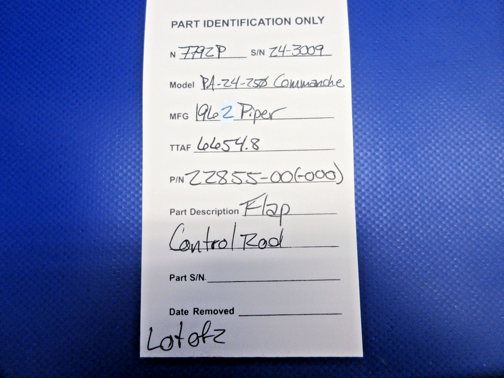 Piper PA-24-250 Comanche Flap Control Rod. P/N 22855-00, 22855-000. LOT OF 2. Removed in good condition from a parted out 1962 Piper PA-24-250 Comanche N7792P, S/N 24-3009. TTAF 6,654.8. Guaranteed to pass inspection or your money back.