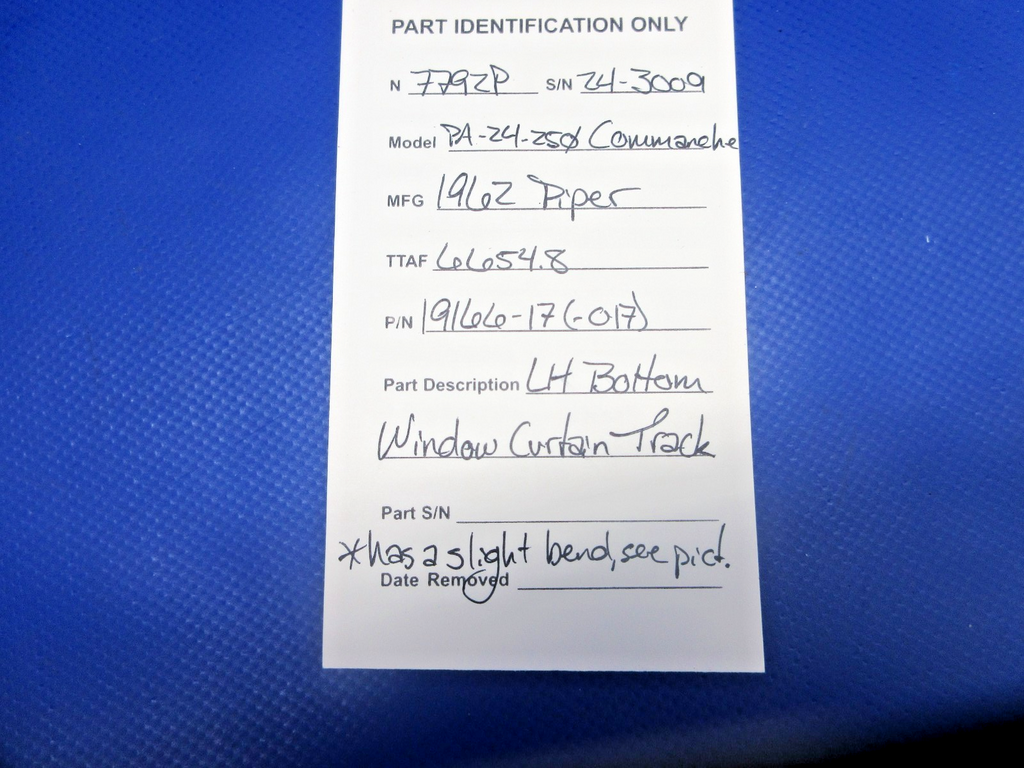 Piper PA-24-250 Comanche Left Hand Bottom Window Curtain Track. P/N 19166-17, 19166-017. Has a slight bend, see picture. Removed in good condition from a parted out 1962 Piper PA-24-250 Comanche N7792P, S/N 24-3009. TTAF 6,654.8. Guaranteed to pass inspection or your money back.