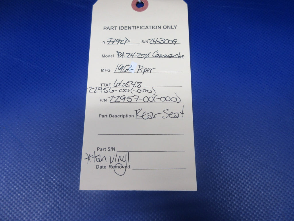 Piper PA-24-250 Comanche Rear Seat. P/N 22957-00, 22957-000, 22956-00, 22956-000. Tan Vinyl. Removed in good condition from a parted out 1962 Piper PA-24-250 Comanche N7792P, S/N 24-3009. TTAF 6,654.8. Guaranteed to pass inspection or your money back.
