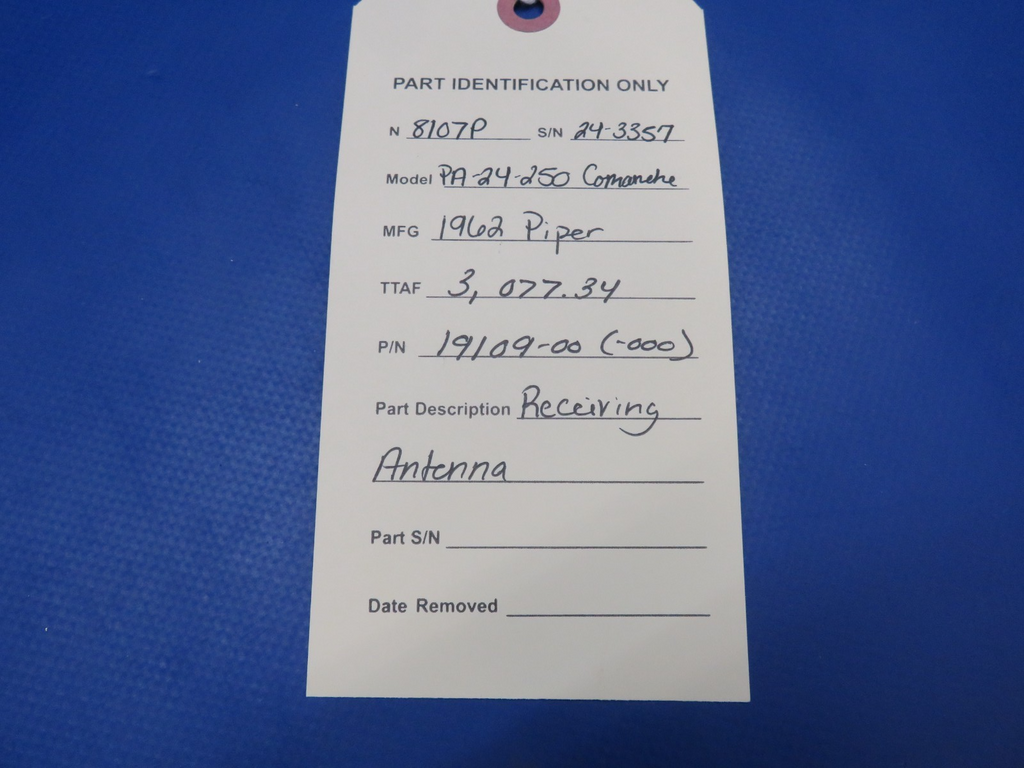 Piper PA-24-250 Comanche Receiving Antenna with Bracket. P/N 19109-000, 19109-00. Removed in good condition from a parted out 1962 Piper PA-24-250 Comanche N8107P, S/N 24-3357. TTAF 3,077.34. Guaranteed to pass inspection or your money back.
