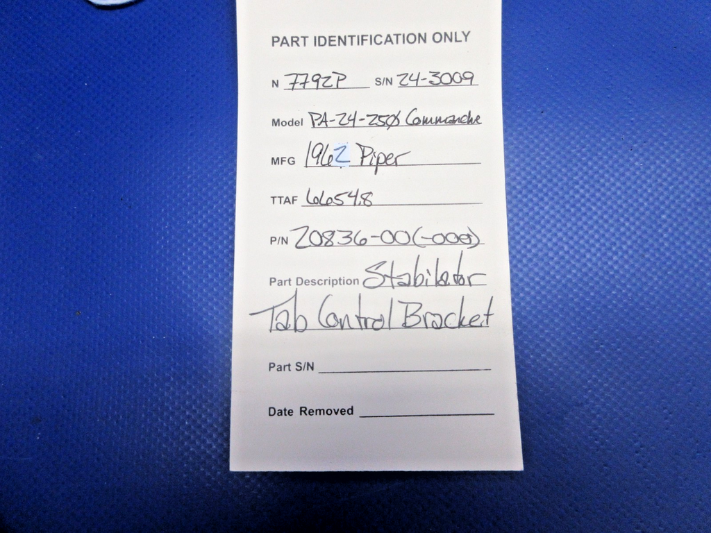 Piper PA-24-250 Comanche Stabilator Tab Control Bracket. P/N 20836-00, 20836-000. Removed in good condition from a parted out 1962 Piper PA-24-250 Comanche N7792P, S/N 24-3009. TTAF 6,654.8. Guaranteed to pass inspection or your money back.