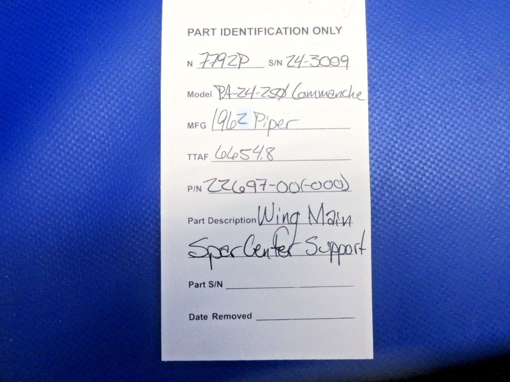 Piper PA-24-250 Comanche Wing Main Spar Center Support. P/N 22697-00, 22697-000. Removed in good condition from a parted out 1962 Piper PA-24-250 Comanche N7792P, S/N 24-3009. TTAF 6,654.8. Guaranteed to pass inspection or your money back.