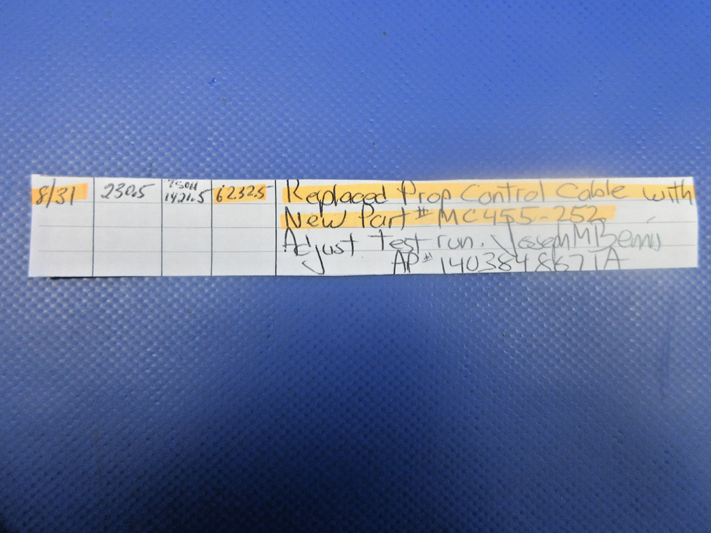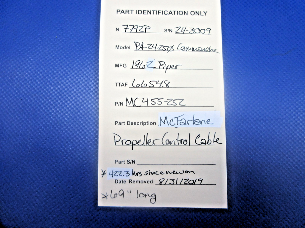 Piper PA-24-250 Comanche McFarlane Propeller Control Cable. P/N MC455-252. 422.3 Hours since new on 08/31/2019. 69" Long.