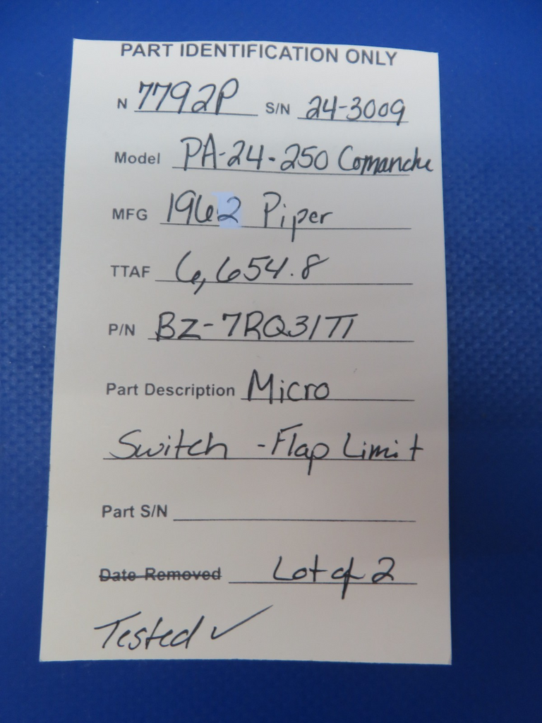 Piper PA-24-250 Comanche Micro Switch Flap Limit. BZ-7RQ31T1. LOT OF 2. This item was recently tested and found to be in working condition. Removed in good condition from a parted out 1962 Piper PA-24-250 Comanche N7792P, S/N 24-3009. TTAF 6,654.8. Guaranteed to pass inspection or your money back.