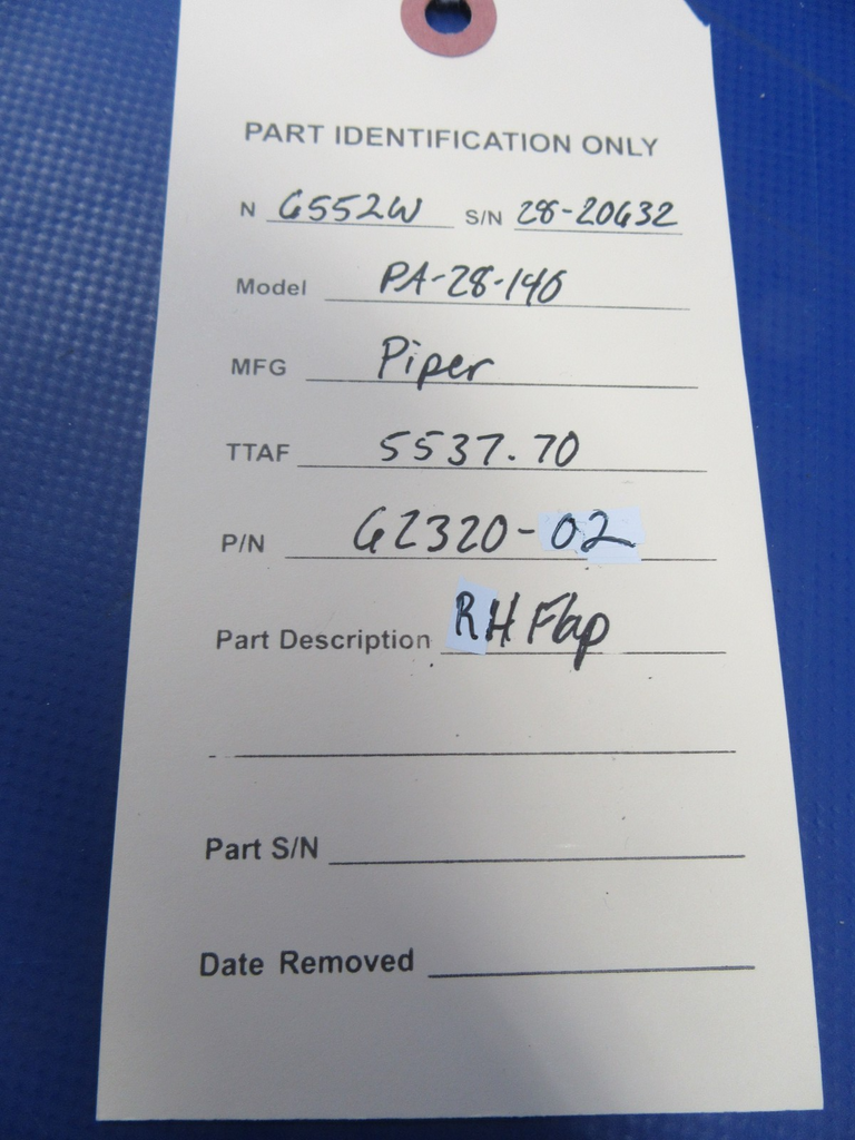 Piper PA-28-140 Cherokee RH Flap P/N 62320-02 / 62320-002. Convex Stiffeners. Minor dings, see photos. Removed from parted-out 1965 Piper PA-28-140 N6552W, S/N 28-20632. Aircraft TT 5537.70. Guaranteed to pass inspection or your money back.