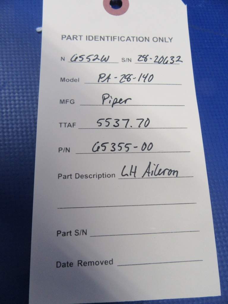 Piper PA-28-140 LH Aileron P/N 65355-00, 65355-000. Convex Stiffeners. Minor dings, see photos. Removed from parted-out 1965 Piper PA-28-140 Cherokee N6552W, S/N 28-20632. Aircraft TT 5537.70. Guaranteed to pass inspection or your money back.